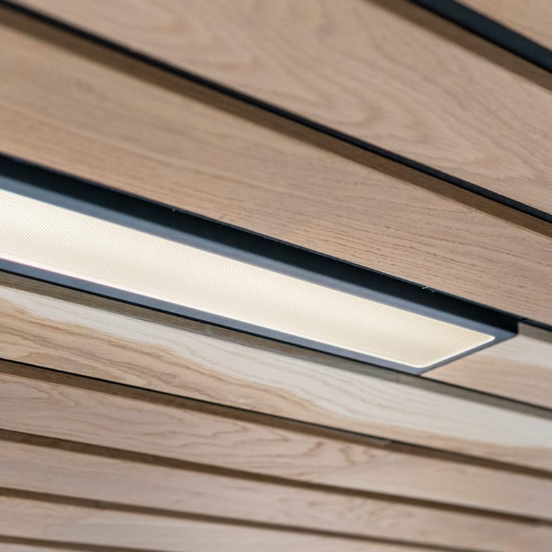 Fusion-L est un luminaire linéaire avec une lentille prismatique ou un diffuseur opale, conçu pour application dans les plafonds suspendus à panneaux linéaires en bois. Le luminaire permet de créer un éclairage intégré dans des lignes de plafond en bois épurées et uniques, où lumière et architecture se rencontrent harmonieusement.